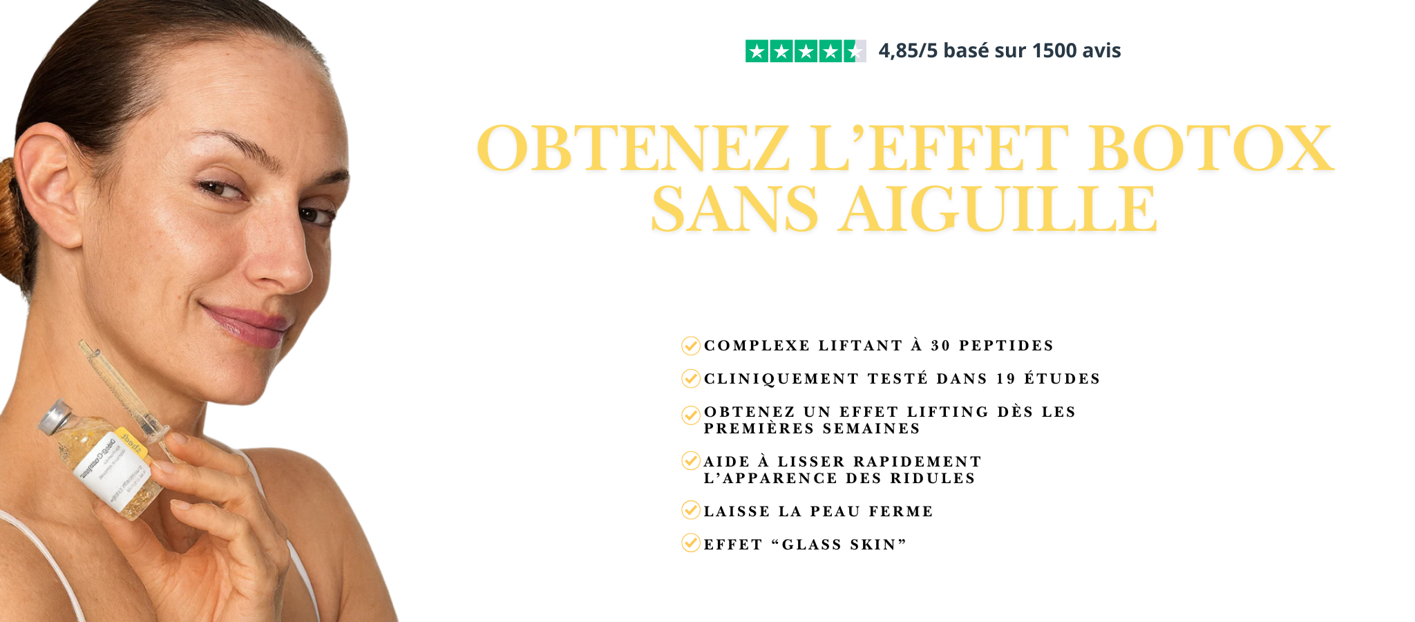 Il ne s'agit pas d'un injectable et il ne remplace pas un acte médical - mais sa formule contient de puissants peptides à "effet Botox" (notamment l'Acétyl Hexapeptide-8), un complexe de 30 peptides, du collagène de très faible poids moléculaire et de la Volufiline™. Cette synergie aide à lisser les rides d'expression, renforce la densité de la peau et procure un aspect visiblement plus lisse et lifté - sans injection, sans temps de récupération, sans visage figé. C'est une alternative sans aiguille, pour un usage quotidien, idéale pour ceux qui recherchent des résultats visibles chez eux.